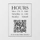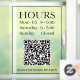 Hours Open Sign: Generate QR code for store entry door or window in black text on transparent background with QR code message.