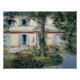 House at Rueil by Edouard Manet, oil on canvas 1882, is a landscape painting of a large yellow house with a tall shade tree, grass, gardens and a walkway path filling the foreground. Manet casually constructs the tranquil scene in contrasting vertical and horizontal geometry, filling the picture plane with middle and foreground landscape elements, capturing the warmth of spring sunlight against the deep, cool shades beneath the luxuriant trees. In a broad range of light to dark and warm to cool tones, the artist captures a seeming moment in time much like his fellow Impressionist painters, though he still boldly deploys the deep ivory black tones that other Impressionists avoided in favour of painterly colour effects.