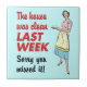 Have a little fun with this tile that shows a 1950s-era housewife holding a plate with the text, "The house was clean last week, sorry you missed it" to the left of her. A fun vintage look if your house isn't always the tidiest. The background colour can be changed by clicking the "Customise It" button and selecting "edit">"Background colour" to choose a new colour. Available with matching products.