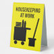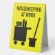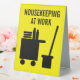 Housekeeping at work custom room cleaning Table Tent Sign for cleaning service or janitor. Add your own custom text and colours optionally. Custom signs for cleaner at hotels, motel, bed and breakfast, hospitality business, hostel, conference, home, office space, restaurant, company, school etc. Yellow and black or custom colours. Housekeeper logo with cleaning trolley on wheel, broom or mop, bucket, towels and bottles. Printed on two sides.