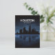 A flat-vector illustration of the Houston skyline silhouetted against a dark, cloudy night sky, with a deep blue reflection shimmering on the water below.