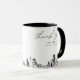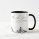 Modern Houston skyline coffee mug favour gift with "thank you" script. The design showcases a stunning sketch with the ability to customise your names and exact location. Enter the Zazzle design tool for additional customisations.