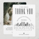 A special thank you flat card tailored to your wedding in the beautiful city of Houston, Texas. It features a stylised skyline of the city on the front of the card. On the inside is a spot for your own unique message and an optional photo. Use the customisation functions to change the photo filter to colour, and to resize it as needed. All elements of this item are unlocked and adjustable, so have fun being creative!