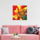 Accent your living space with this square style, wrapped canvas print that features the colorful, photographic image of a black and yellow, striped Hover fly on an orange and yellow Collarette Dahlia. A beautiful and stunning, floral image! Customize your canvas print size as desired along with frame options.