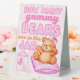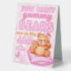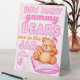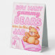 Guess How Many Gummy Bears Baby Shower Game. Cute Pink & Brown Baby Girl Theme with Stuffed Brown Teddy Bear sitting on a Pink pillow with Pink bow. ©2023 Miss Sassy Party Designs™