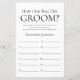 This modern How Old Was The Groom? bridal shower game sheet is simple and charming - perfect for any shower. This fun and easy game is sure to bring lots of laughter to any shower! Have family and friends send you pictures of the groom at different ages and have them printed. Number them and set them near these game sheets. Simply give a sheet to each guest (don't forget the pens) and let the competition begin! You'll be amazed at how many people really know the ages of the groom. In seconds you can see how your game sheet will look. Simply select Personalise this Template and type in the groom's name.