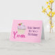 A birthday greeting card with a message inside. Designed with a yummy pink cupcake with scrumptious swirls of pink frosting with a yellow cupcake holder. A raspberry with stem and leaves on top. Dreamy and delicious. Text says Yum in a fancy trendy font. Set on a pastel pink backdrop. A message inside the card can be customised or left as is.