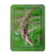 A macro shot of a flower of grass sprinkled with water droplets, the seeds turning the tip purple against a backdrop of rich green. Framing the photo is a glass mosaic of the field around it.