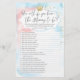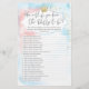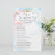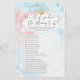 This baby shower game card features a script modern font on pink blue watercolor background, perfect for a gender reveal party.