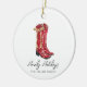 These christmas ornaments feature a watercolor portrait of a pair of red cowgirl boots with the caption "howdy holidays".
