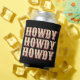 Retro style cowboy "Howdy Howdy Howdy" text design with striped letters in yellow, red and beige colours