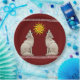 A colourful graphic of howling coyotes in the colours and style of traditional southwestern art.
