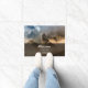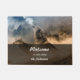 This cool doormat features a photo of howling wolves in the night. The bottom portion features a transparent black text field as a layer above the photo with a white custom script welcome to our home and the customisable name.