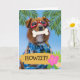 Howzit? Hi and hello greeting card to keep in touch with someone. Tropical themed card with a dog wearing red swim goggles and a tropical Hawaiian shirt with tropical flowers and palm fronds surrounding it. Art, image, and verse copyright © Shoaff Ballanger Studios, 2022.