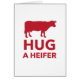 Humour for farmers, cattle ranchers. Image of a young cow with the words "Hug a Heifer" beneath it. Great for farmers markets, cow runs, rodeos.