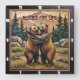 This appealing square wall clock features a highly dimensional illustration of two golden-brown bears hugging in a mountain meadow setting. The artwork is rendered in vibrant brown, green, and pale orange tones, strongly suggesting a deep carved relief or Engraved Wood Look. The bears have highly textured fur and are positioned against a backdrop of dark pine trees and layered blue-gray mountains. The foreground features detailed grass, brush, and light gray rocks, emphasizing the outdoor, nature theme. The carving style gives the entire image a strong three-dimensional, sculpted quality. The large, three-dimensional embossed text "BESTIES FOR LIFE" is carved across the top. The clock face features a simple clock face border with large, white, numbered tick marks (1 to 12) integrated into the outer frame. The artwork is surrounded by a thick, dark brown decorative border that resembles a black wood frame.