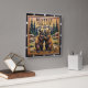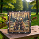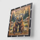 This appealing square wall clock features a highly dimensional illustration of two golden-brown bears hugging in a streamside mountain setting. The artwork is rendered in warm brown, green, and orange tones, strongly suggesting a deep carved relief or Engraved Wood Look. The bears have highly textured fur and are positioned in a landscape featuring a small stream, rocks, and green shrubs. The background includes dark green, stylized pine trees and blue-gray mountains under a pale orange sky. The carving style gives the entire image a strong three-dimensional, sculpted quality. The large, three-dimensional embossed text "BESTIES FOR LIFE" is carved across the top. The clock face features a simple clock face border with large, white, numbered tick marks (1 to 12) integrated into the outer frame. The artwork is surrounded by a thick, dark brown decorative border that resembles a black wood frame.