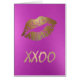 Send your loved ones kisses and hugs with this fun pink foil looking greeting card. Graphics of a gold glittery kiss lip print decorates the front along with gold tone graphic text reading XXOO. Personalise the hot pink text, inside the card, to read what you want.
