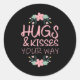 Give hugs and kisses. Flower wreath with hearts. Sweet saying for all couples. Great gift for a birthday, name day or family celebration.
