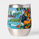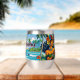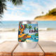 Pretty pop art comic book style ai art. Hula dancer on the beach surrounded by pretty Hibiscus tropical flowers and palm tress with an ocean background.