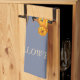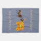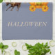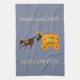 Humble Horse Pumpkin-headed Horseman & Pumpkin Carriage Halloween kitchen towel, with the words "humble and happy" on top, and "HALLOWEEN" at the bottom of the towel, the art is inspired by Disney's Ichabod Crane and Headless Horseman, only the horse and driver, a pumpkin-headed horseman, are humble as they drive a romantic pumpkin carriage. Art by Kristie Hubler