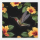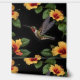 Pictured On Black Is A Hummingbird Flying Toward Yellow Hibiscus Flowers.