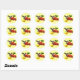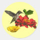 This sticker features a female ruby-throated hummingbird. She hovers in the air while drinking nectar from the golden centre of a bright red zinnia flower. A yellow zinnia blossom is nearby and a few green leaves complete the composition. The colours seem to glow against the pale yellow background.