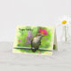 This birthday card features a young ruby-throated hummingbird. He has not yet developed the ruby coloration on his throat. He is sitting on a metal bar, ready to dive into the nectar from the flowers surrounding him. The background is a soft, lovely palette of pink, red, gold, yellow and green. More hummingbirds are inside. You can customise the text to suit your needs.