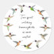 Cute sticker for hummingbird lovers featuring a wreath of hummingbirds that can be found in the US such as Anna's hummingbirds, Allen's, Costa's, Black-chinned, and Rufous and Ruby-throated hummingbirds and the quote "Time spent watching hummingbirds is never wasted." Hand-painted hummingbird images and quote by C. Dobbins.