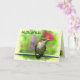 This Día del Padre card features a young ruby-throated hummingbird. He has not yet developed the ruby coloration on his throat. He is sitting on a metal bar, ready to dive into the nectar from the flowers surrounding him. The background is a soft, lovely palette of pink, red, gold, yellow and green. More hummingbirds are inside. All text can be customized to suit your needs.