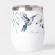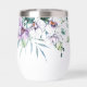 This elegant thermal wine tumbler features a stunning depiction of a hummingbird in mid-flight, its wings showcasing a mesmerising blend of emerald green and amethyst purple, capturing the bird’s graceful and swift movements. The vibrant hummingbird is surrounded by delicate botanicals, including orchids with soft purple and white petals and yellow centres. The lush green foliage, intricately detailed, enhances the floral elements, creating a beautiful and harmonious design.