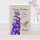 A hummingbird sipping nectar from a purple delphinium creates a beautiful greeting for a birthday. You can personalise this card with any name and occasion.