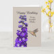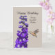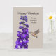 A hummingbird sipping nectar from a purple delphinium creates a beautiful greeting for a birthday.