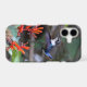 Photograph of a hummingbird mid flight hovering over red flowers.