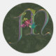 A beautiful hummingbird in iridescent blues and greens, drinking from an ornate deep pink flower hanging from a metallic initial M, shimmering in rainbow colours