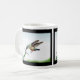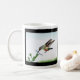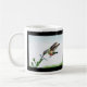 The image on this mug depicts a hummingbird as she stretches for the nectar in a flower. The fast shutter speed has frozen the wings at the top of their arc.