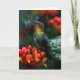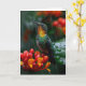 A vibrant hummingbird showcasing shimmering plumage perches on a bright flower during a gentle rainfall. Nature's beauty and serenity are captured in this colourful and vivid moment in the rain.