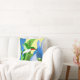 Decorative pillows with hummingbird and blue flower art on yellow background