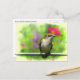 This postcard features a young ruby-throated hummingbird who has not yet developed the ruby coloration on his throat. He is sitting on a metal bar, ready to dive into the nectar from the flowers surrounding him. The background is a soft, lovely palette of pink, red, gold, yellow and green.