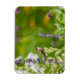 A tiny hummingbird rests on a blossom, overlooking its beautiful garden.