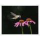 A sweet little hummingbird stops to check out some purple coneflower blossoms. The shady background makes the image pop.