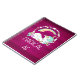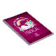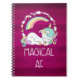 A spiral notebook with a humourous design. A sleeping uncorn with a fancy mane and tail. Deocrated with a trio of stars stars. A rainbow arches overhead. A circle made up of clouds, hearts and flowers for additional girly flair. Typography says Magical AF. Humourous and cute. The background is a dark reddish pink striped pattern which has some grunge style faded writing, marks, and music notes on the edges, which may or may not appear on your product depending on if the edges of the pattern are cut off during printing. Creative and cool.