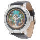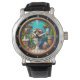 This image is a circular WATCH with a black rim and white numbers, featuring a whimsical illustration of a shocked-looking orange pufferfish wearing snorkelling goggles and reading a newspaper. while sitting on a toilet. The scene is set underwater with blue tiled walls, seaweed, starfish, and a seahorse. Bubbles float around the quirky character, all enclosed within a golden inner frame.