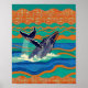 Museum-quality art print. Japanese woodblock print style with visible wood grain texture and wave patterns depicting humpback whale breaching, created in jewel tones with gold accents. Frame not included.
