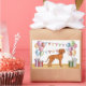 Destei's original cartoon illustration of a cute Hungarian Vizsla breed dog. The dog is placed in a colourful birthday setting with pastel colour birthday balloons, gifts and a bunting banner. The pastel colours include pink, green, blue, red, orange and purple. The dog is standing on a yellow wood floor texture and the background has a playful pastel colour polka dot pattern.