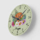 Destei's original cartoon illustration of a cute Hungarian Vizsla breed dog's head close-up surrounded by colourful summer wildflowers. There is a blush pink flower, a purple flower, a dark pink flower and a white daisy flower together with some green leaves and branches. The background colour is green with a light polka dot pattern. The background colour can be changed to any other colour and the polka dot pattern can be removed, if so wished. The hours are marked with numbers. The hours and minutes are shown with a dotted clock face. There is also a personalizable text area for a name or other custom text in a lovely script font.