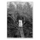A black and white picture of a forest hunter's hut with a wooden stairs on top of a tree.