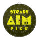Funny dartboard for pub darts in the man cave. Camouflage shades of light brown with light olive green for the words. A darker olive green background. STEADY AIM FIRE in huge text with holes in the letters. You can change colours of text or background, but these colours will catch your eye. From She Wolf Medicine