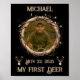 Honor the exciting milestone of a young hunter's first deer with this beautifully designed poster. The centerpiece is a photo of the triumphant hunter, encircled by a rustic wreath of branches and foliage, evoking a natural woodland setting. A majestic whitetail buck illustration complements the theme, adding a touch of wilderness charm. This poster serves as a wonderful way to immortalize a child's hunting accomplishment and create a lasting memory of their first big catch.