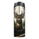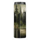 A majestic deer with prominent antlers is centred within the crosshairs of a rifle scope, its gaze directed forward. The scene is set against a backdrop of dense pine trees, with two rifle cartridges lying on a wooden surface in the foreground, strongly suggesting a hunting scenario. The artwork has a detailed, illustrative quality.